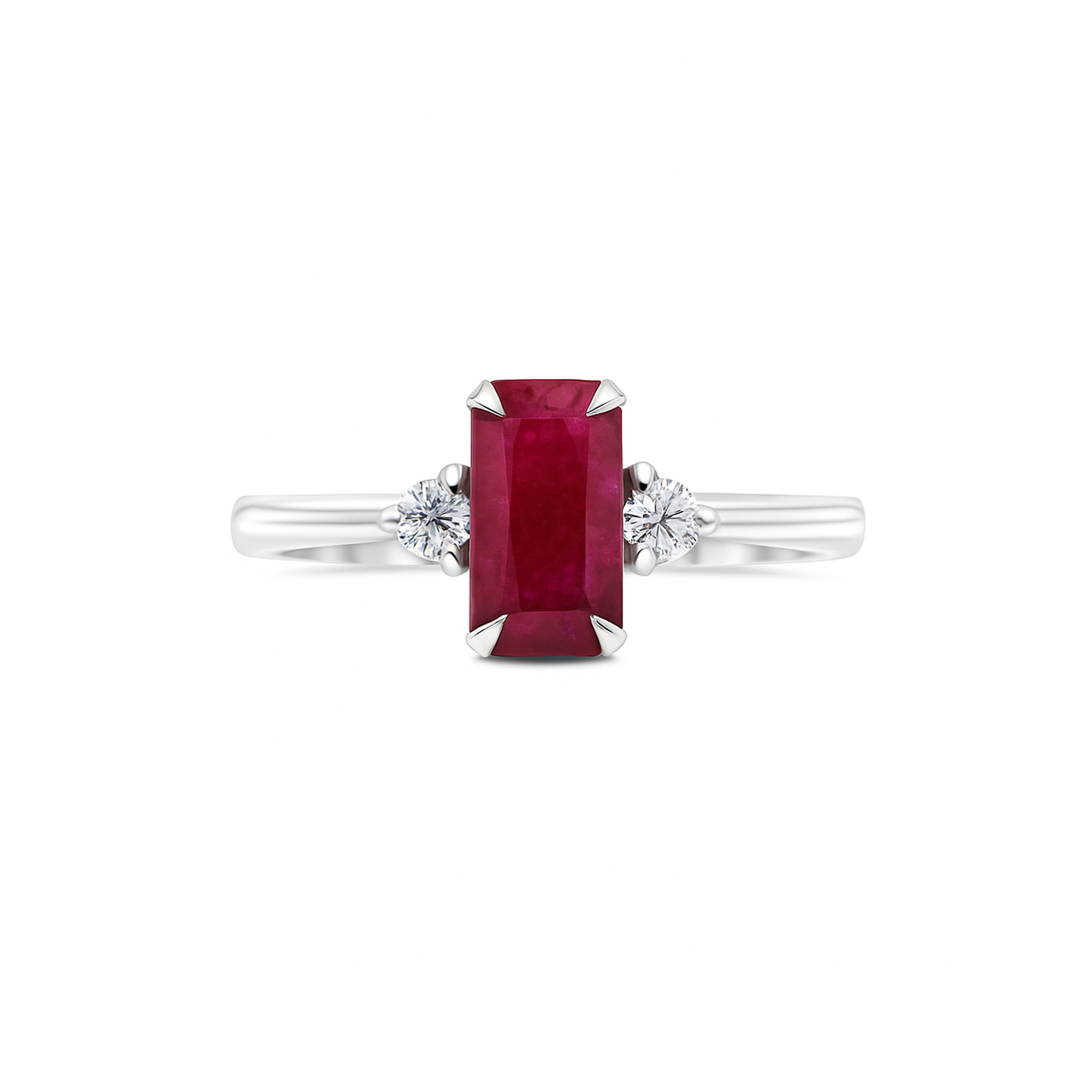 Framing the center ruby are brilliant white shoulder diamonds, precisely set to draw the eye and amplify the ruby’s fire. This Emerald Cut Ruby ring with Shoulder diamonds add just the right amount of sparkle, making the ring feel both majestic and balanced. Gemstone rings