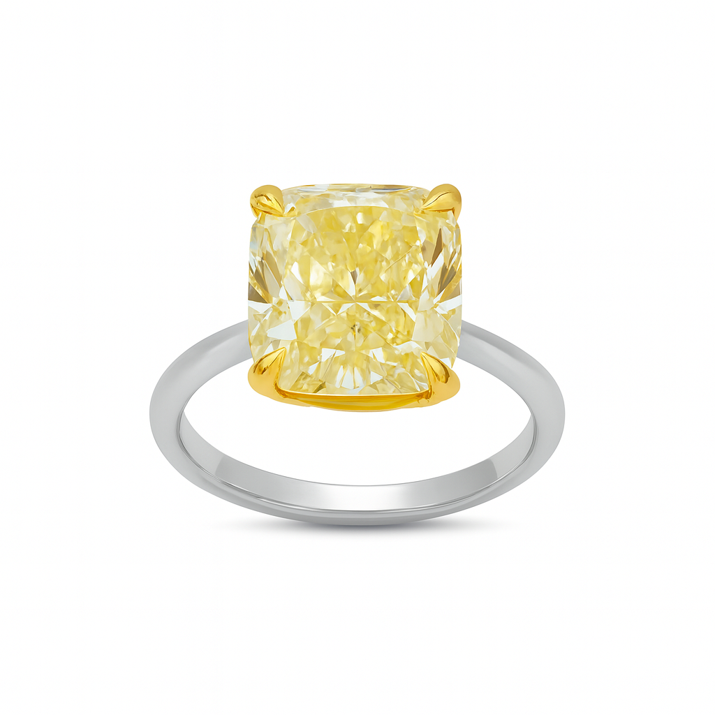 Yellow Cushion Shape Diamond Ring made with 8.53 carats in classic four prong high setting in 18k white gold 3.95 grams. Shop Yellow diamonds in Dubai Beladamaz